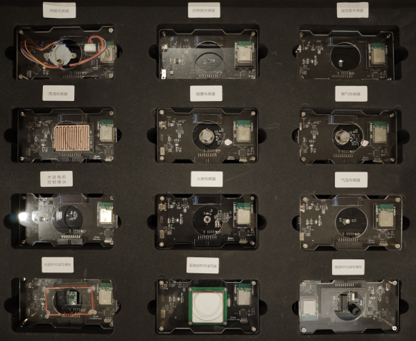 自选硬件平台包含火焰传感器、雨滴传感器、光照度传感器、烟雾传感器、燃气传感器、温湿度传感器、PM2.5传感器、气压传感器、人体传感器、三轴加速度传感器、超声波车位传感器、无线车位感知传感器、RFID高频读写器、RFID低频读写器、RFID超高频读写器、继电器控制模块、直流风扇控制模块、蜂鸣器求助按钮控制模块、步进电机控制模块、LCD控制显示模块等20传感器/执行器,自选硬件平台中还包含边缘网关控制器等核心部件。